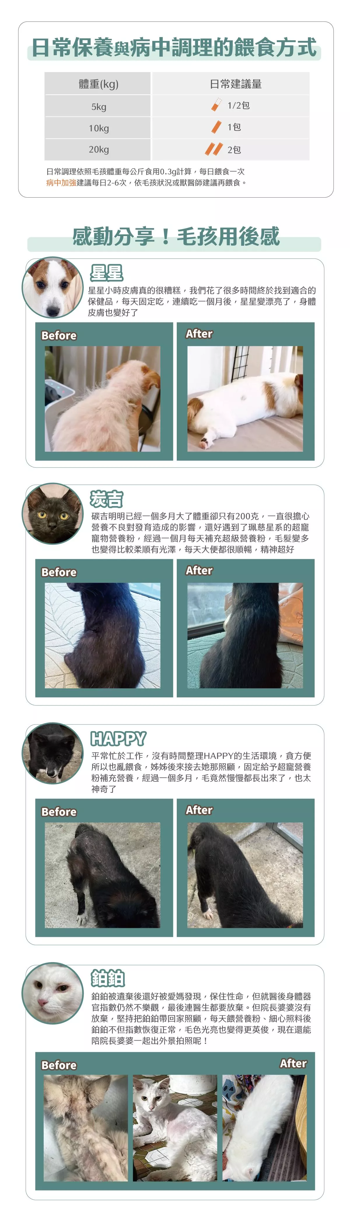 日常營養補充:依照犬貓體重每公斤餵食0.3克每日一次,(灌食用量相同)。
