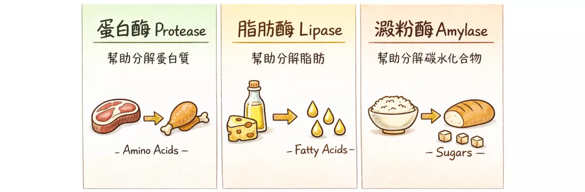 當食物進入體內後,這些酵素會協助將蛋白質、脂肪與碳水化合物分解成較小分子,