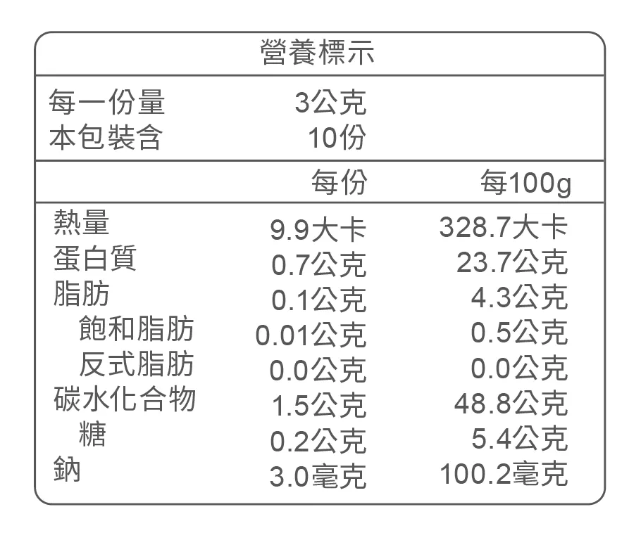 (營養標示 每100g 粗蛋白質10.00g、粗脂肪0.05g、粗纖維1.00g、粗灰分1.00g、水分87.00g、代謝能38.75kcal)